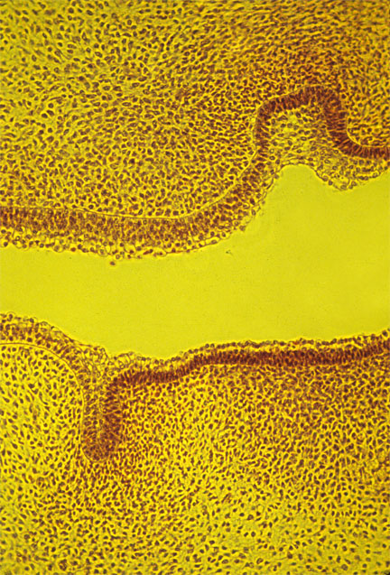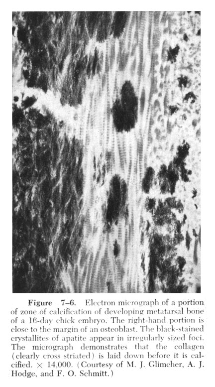 Epiphysis of a rabbit bone, photographed by polarized light with quarter-wave filters, so that colors of birefringent materials will vary as a function of direction. Cartilage in the upper right area is gradually being destroyed and replaced by bone, advancing from the lower left, into the center. The yellow color results from collagen fibers in the cartilage being oriented transverse to the advancing bone. The dark blue streaks in the center show that collagen has become reoriented by 90°, so as to become parallel to the direction of the advancing bone. Stacks of enlarged chondrocytes are visible in the pale areas between the blue streaks.