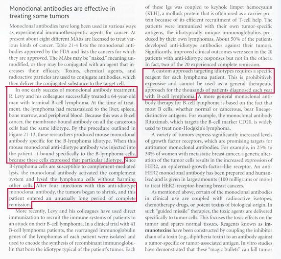 ![]() From Kuby Immunology, 6th edition, by Thomas J. Kindt, Barbara A. Osborne, and Richard A. Goldsby. The first paper describing this treatment appeared in 1982: Miller, R.A., D.G. Maloney, R. Warnke, and R. Levy (1982). Treatment of B-cell lymphoma with monoclonal anti-idiotype antibody. New England Journal of Medicine 306(9):517-22. Many additional papers have been published since then by Levy and colleagues, but the treatment has not been adopted, and the textbook authors continue to refer to it as "prohibitively expensive" without presenting any details of the cost, or comparison with the cost the now-standard eradication of all B cells (not just the lymphoma cells) with monoclonal antibodies to the protein CD20. |
