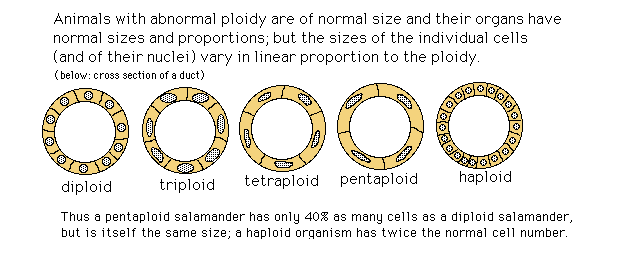 PloidyTwo interesting aspects of regulative development:1) Tetraploid cells have (exactly!) twice the volume of diploid cells; and haploid cells have exactly half the volume. 2) Organ sizes remain the same, despite cell sizes being half or twice as big as in diploid animals of that species.