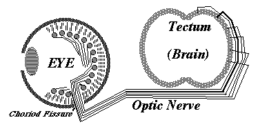 Nerve fibers with growth cones at their tips are extended from the developing eye through the choroid fissure, and go to a specific area of the brain, the optic tectum. The locomotion of the growth cones is "amoeboid", of the same type that transports particles.