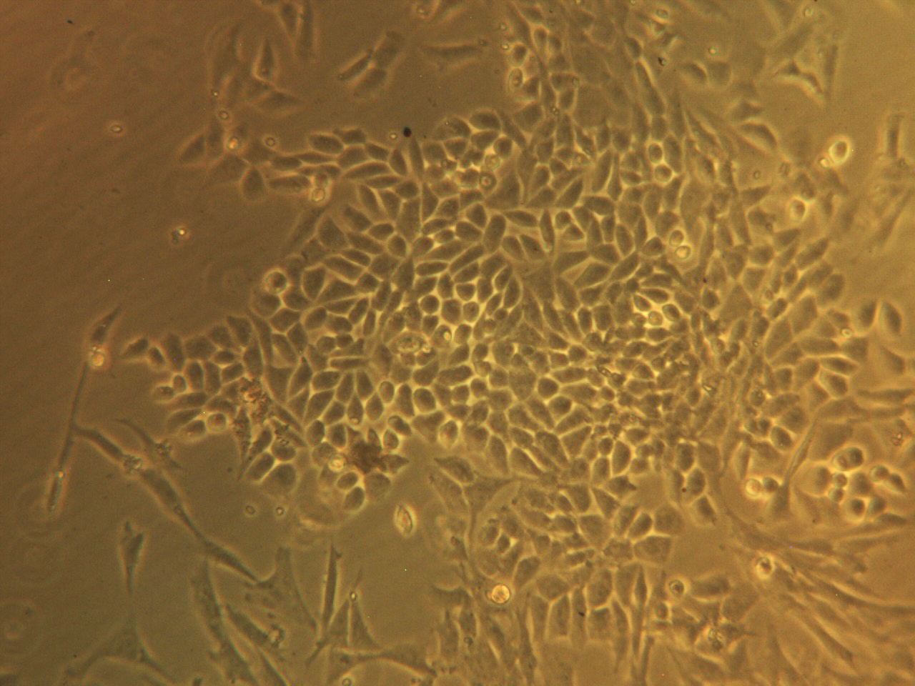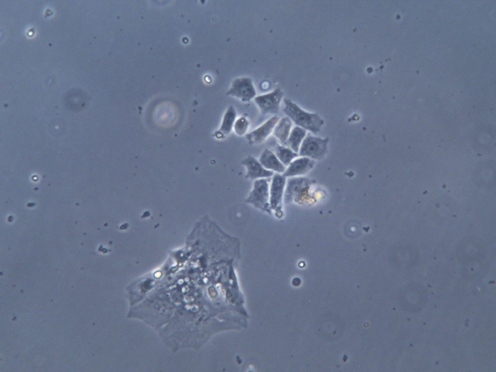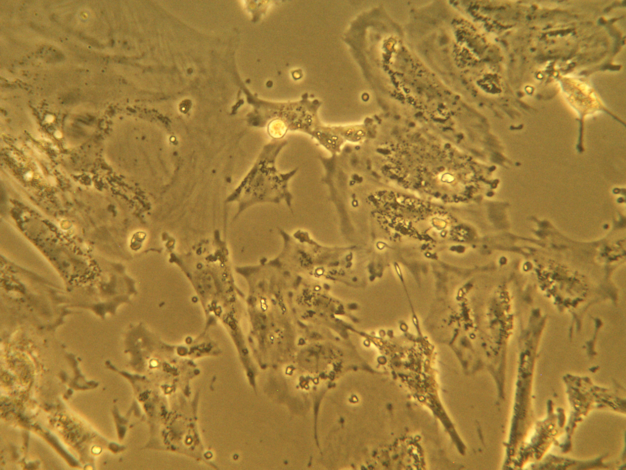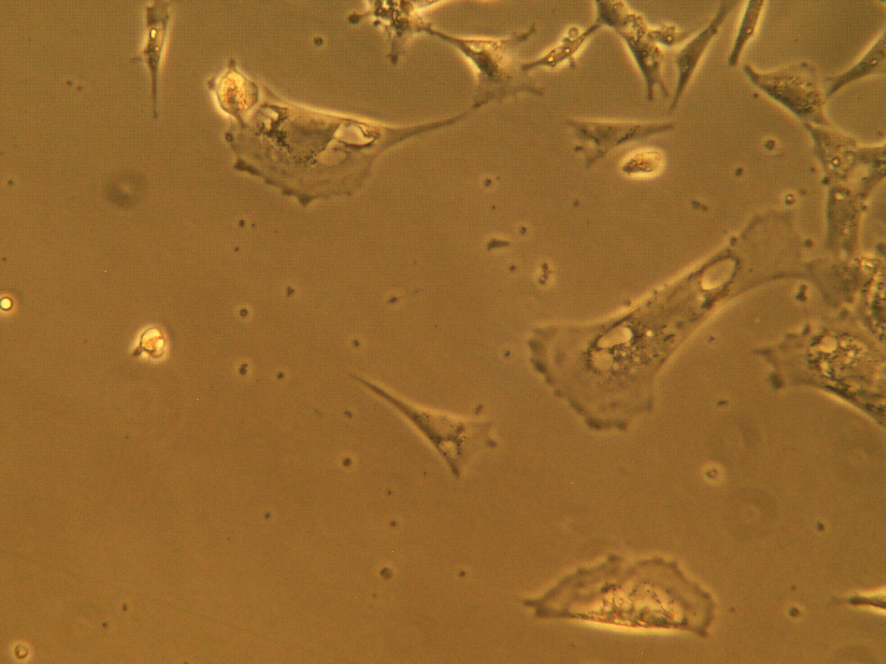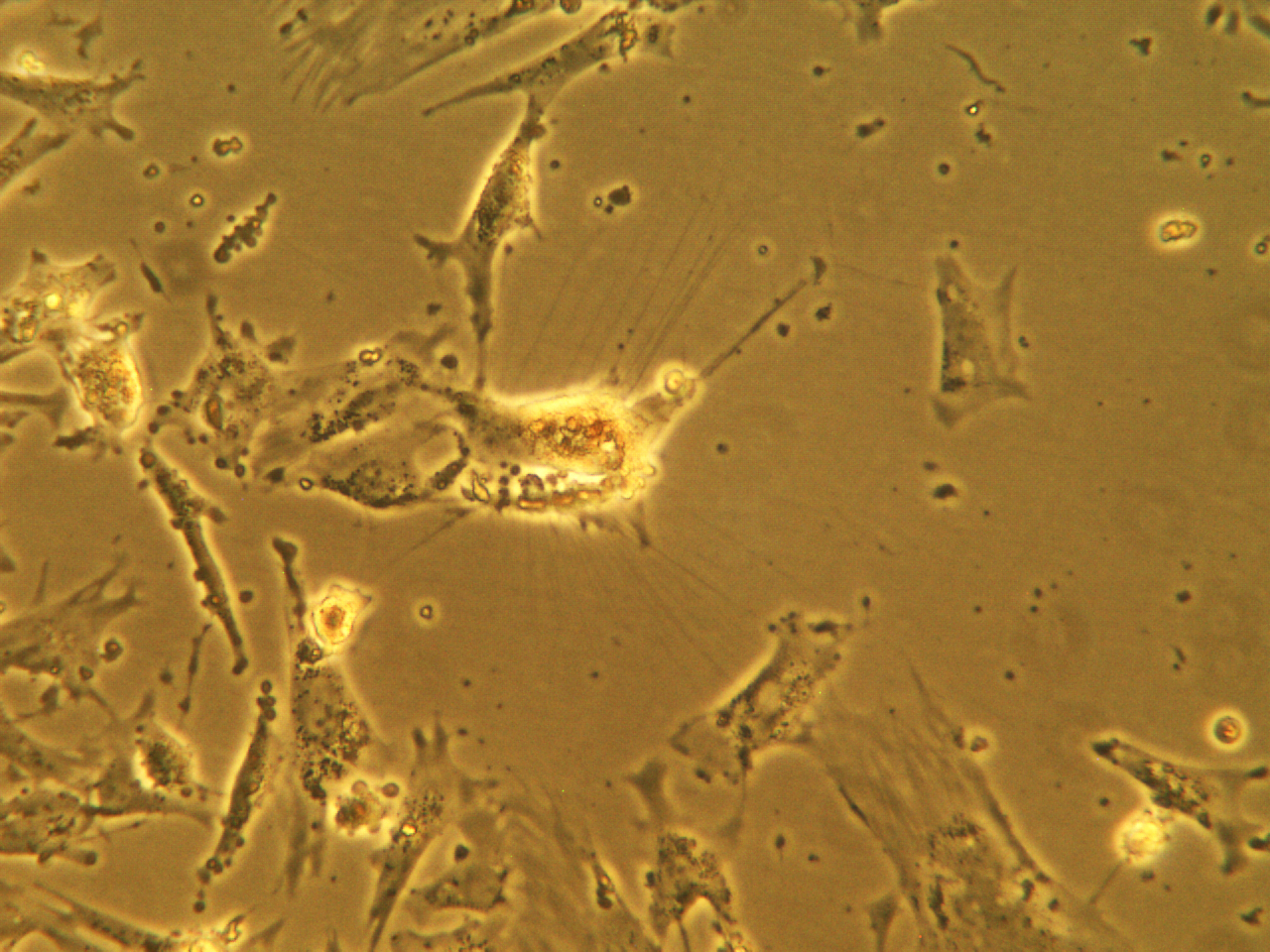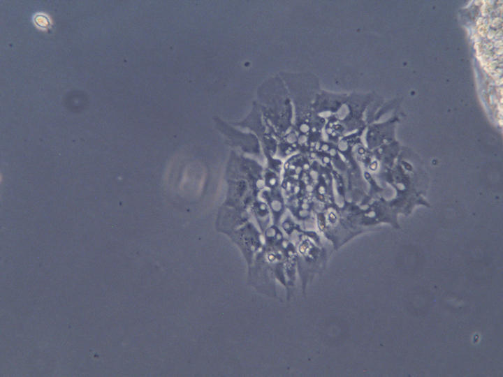 liver cells; the cell in the center has rounded up, leaving retraction fibers attached to the substratum