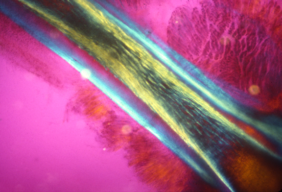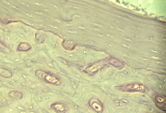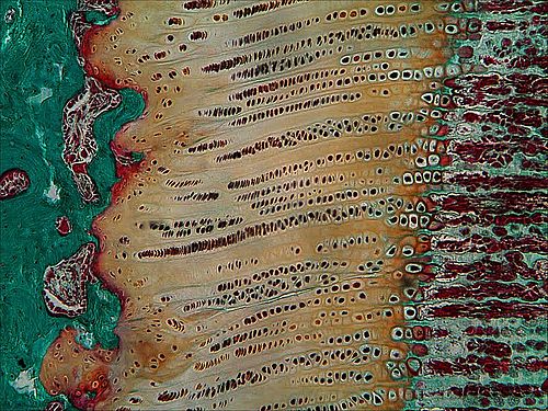 Epiphysis of a rabbit bone, photographed by polarized light with quarter-wave filters, so that colors of birefringent materials will vary as a function of direction. Cartilage in the upper right area is gradually being destroyed and replaced by bone, advancing from the lower left, into the center. The yellow color results from collagen fibers in the cartilage being oriented transverse to the advancing bone. The dark blue streaks in the center show that collagen has become reoriented by 90°, so as to become parallel to the direction of the advancing bone. Stacks of enlarged chondrocytes are visible in the pale areas between the blue streaks.