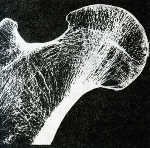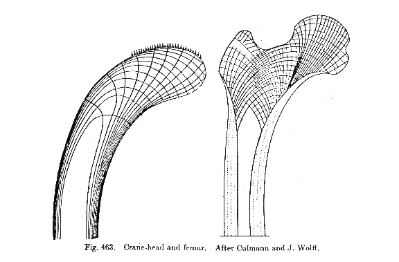 Drawing from the classic book On Growth and Form, by D'Arcy Thompson, showing the forces in the head of a femur bone.