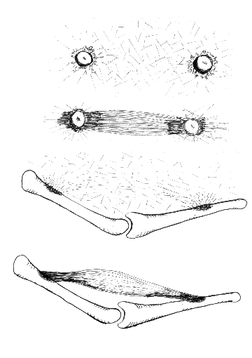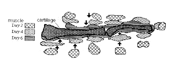 This figure is from Stopak and Harris (1982). Connective Tissue Morphogenesis by Fibroblast Traction. Developmental Biology 90, 383-398. Leg bones from 10-day old chick embryos were put in a culture dish with pieces of thigh muscle in a collagen gel. The collagen becomes aligned between the muscle explants and the bones as a result of cell traction, forming an anatomical pattern that looks like a natural leg.