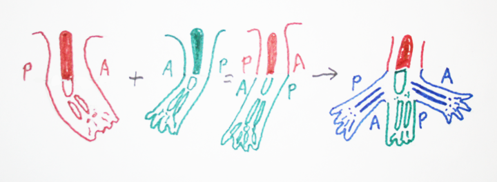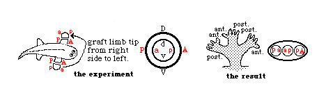 LIMB GRAFTS Triple-branching of 180-degree-rotated limb grafts is an example of diffusion-like filling-in of intermediate behaviors of cells.