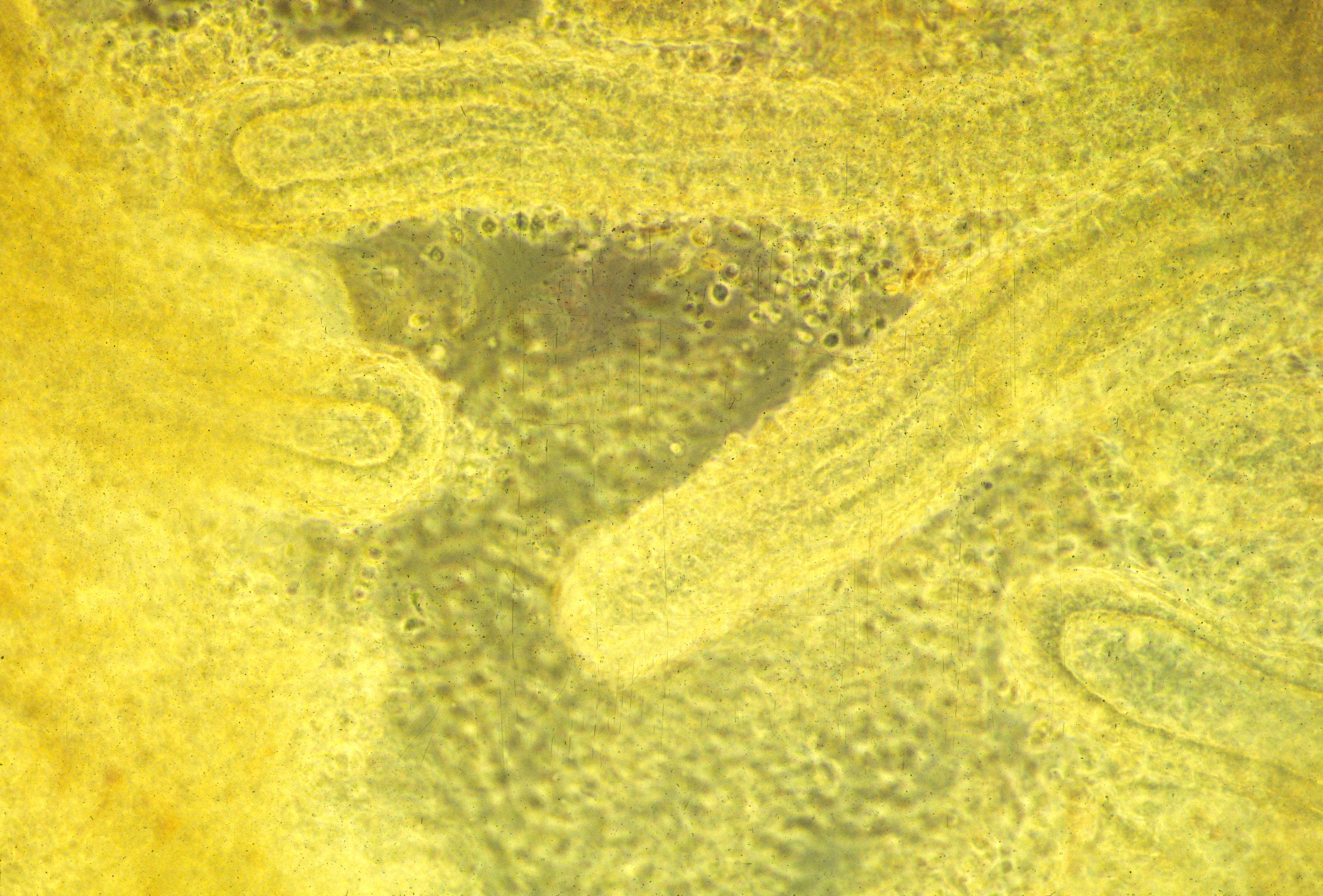 Epithelial tubes forming in an intestine. Some form inward, and others form outward.
